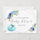 Sweet baby blue and yellow florals and silver geometric frames to celebrate at a baby shower. A large aqua blue pumpkin at lower left. Edit text areas to create a unique and special baby shower party game of Baby's Name game.