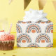 Halloween-themed wrapping paper with a Halloween version of a boho rainbow with a little pumpkin, an arch of bats, and a gender-neutral Halloween color palette.
