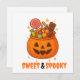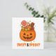 Send spooky-sweet greetings with this festive flat card featuring a cheerful pumpkin bucket overflowing with colorful candies and lollipops. Perfect for party invitations, thank-you notes, or seasonal messages, this playful design adds a charming Halloween touch to your correspondence. Ideal for kids’ parties, trick-or-treat events, or autumn celebrations!