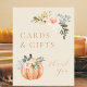 Pumpkin fall 1st birthday cards and gifts table sign is the perfect addition to any little girl's fall or pumpkin themed first birthday party. This sign features a simple and elegant muted floral, greenery, and pumpkin design that will look great with your other party supplies and decorations.