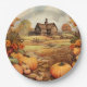 Paper plates with a rustic image featuring lovely orange pumpkins ready to be harvested. An old wooden farmhouse in the background.