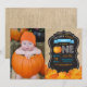 Pumpkin First Birthday Invitation with custom photo, orange, blue and burlap background. For further customization, please click the "Customize it" button and use our design tool to modify this template.