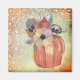 An elegant watercolor pumpkin and flowers on a lacy look background. In colors of copper orange, green plum purple. A pretty fall, autumn floral pumpkin design.