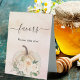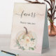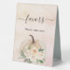 A blush pink and rose gold gradient background, a cream colored pumpkin and flowers. Text: Favors, please take one.