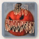 This graphic drawing, has been digitally-edited, to enhance, this vibrant, orange, and black, pumpkin, with menacing, grin-leaning, towards the right, against a blue-gray, background, with Happy Halloween, Emblazoned, across the front, in macabre, pale-colored, lettering.