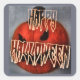 This graphic drawing, has been digitally-edited, to enhance, this vibrant, orange, and black, pumpkin, with menacing, grin-leaning, towards the right, against a blue-gray, background, with Happy Halloween, Emblazoned, across the front, in macabre, pale-colored, lettering.