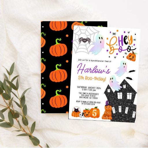 Purple, Black and Orange Hey Boo Halloween Party with Ghost and a Haunted House Birthday Party Paper Plates