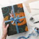 A festive Halloween design featuring glowing jack-o’-lanterns, eerie haunted houses, swirling bats, and autumn leaves. Bare trees and teal swirls add a mystical touch, creating a spooky yet playful atmosphere perfect for seasonal wrapping paper, décor, and craft projects.