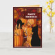 A graphic illustration of a pumpkin patch with black cats on a Birthday greeting card. The card has a customizable verse and text templates for your personalization. Original artwork: Copyright Charmaine Paulson