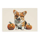 A happy Corgi is joyfully surrounded by Halloween pumpkins.