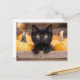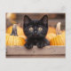 Adorable black kitten with golden eyes peeks out from a crate surrounded by pumpkins.