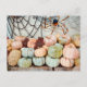 The design features a pile of pastel and rustic pumpkins in shades of sage green, peach, and cream, surrounded by a festive spider web and a playful Halloween spider. Perfectly blending the coziness of harvest season with a hint of Halloween mystery, this postcard makes a delightful keepsake or a charming seasonal greeting.