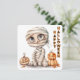 A wide-eyed mummy wrapped in soft white bandages sits gently on the ground, head tilted with quiet charm. Flanking the character are two carved pumpkins—one stacked in a double-tiered design—alongside a tiny skull and scattered autumn leaves. The muted palette and whimsical style blend Halloween mischief with seasonal warmth, capturing a moment of stillness and spooky sweetness in a cozy fall setting.