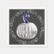 A transluscent, silvery white glass pumpkin with a blue stem is set on a gray background and framed with a pretty floral scroll frame in silver. Very pretty, very classy.