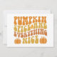 This delightful fall design captures the essence of the season with the phrase "Pumpkin Spice and Everything Nice" presented in a bold, retro-inspired font. The text is arranged in a playful, wavy layout that gives the design a dynamic and energetic feel. Each word is filled with warm autumnal hues, including shades of orange, yellow, and brown, which evoke the cozy and inviting atmosphere of fall. The design is further embellished with charming illustrations of pumpkins and a single autumn leaf, adding a touch of seasonal flair.