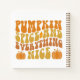 This delightful fall design captures the essence of the season with the phrase "Pumpkin Spice and Everything Nice" presented in a bold, retro-inspired font. The text is arranged in a playful, wavy layout that gives the design a dynamic and energetic feel. Each word is filled with warm autumnal hues, including shades of orange, yellow, and brown, which evoke the cozy and inviting atmosphere of fall. The design is further embellished with charming illustrations of pumpkins and a single autumn leaf, adding a touch of seasonal flair.