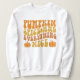 This delightful fall design captures the essence of the season with the phrase "Pumpkin Spice and Everything Nice" presented in a bold, retro-inspired font. The text is arranged in a playful, wavy layout that gives the design a dynamic and energetic feel. Each word is filled with warm autumnal hues, including shades of orange, yellow, and brown, which evoke the cozy and inviting atmosphere of fall. The design is further embellished with charming illustrations of pumpkins and a single autumn leaf, adding a touch of seasonal flair.
