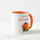 A cute hand drawn pumpkin, sunflower and mum graphic with the text, "Pumpkin Spice and Everything Nice" coffee mug for Autumn, Fall and Halloween season.