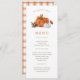 This cute and stylish fall pumpkin thanksgiving dinner menu features beautiful watercolor burnt orange and white pumpkins and autumn florals with an orange and white buffalo check plaid pattern on the back.