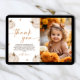 Express your heartfelt thanks with a personalized touch using our **Pumpkin Themed Birthday Photo Thank You Card**. Perfect for following up after your pumpkin-themed birthday party, these cards feature a festive and warm design with space to include a photo of the birthday celebration or the birthday child. Adorned with charming pumpkin and autumn leaf motifs, these cards offer a beautiful way to convey your gratitude to guests for their gifts and presence. Customizable with your message, they make a memorable keepsake that your guests will cherish.
