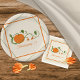 I love when it is time to work with fall colors! These plates feature a large orange pumpkin and green vines with leaves in the center, and your text is below. The design is framed with fun orange and green squares randomly angled. Please enjoy your event!