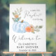 A cute white acrylic baby boy shower welcome sign featuring "A Sweet Little Pumpkin Is On his Way" in modern grey typography and a chic script with a heart swash, and a watercolor of a pastel blue pumpkin, florals and greenery. Personalize the mother's name and the shower date in simple grey typography.