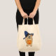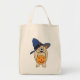 Whimsical cartoon dog in a wide wizard hat carries a glowing jack-o'-lantern. Bold lines, warm autumn colours, Halloween vibe, ideal for playful apparel and festive gifts.
