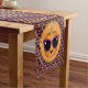 This fun Halloween table runner is decorated with a graphic design featuring an orange jack o’ lantern wearing cool purple cat style sunglasses from the era of the 1950’s.