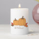 A lovely Thanksgiving pillar candle with two orange pumpkins and some leaves . Personalize it with a name .