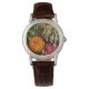 Women’s classic brown leather strap watch with an image of an orange and green pumpkin, and a yellow pumpkin on red, gold and green fall leaves. Optional silver clock face. See matching round charm and rectangular double-sided acrylic keychain. See the entire Thanksgiving Watch collection under the ACCESSORIES category in the HOLIDAYS section.