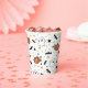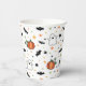 Cute Halloween themed paper cups for Halloween parties, Halloween themed baby showers, and Halloween birthday parties with a pattern of happy ghosts, pumpkins, bats, and stars.