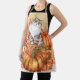 Apron for all of your fall/autumn/Thanksgiving meals and cookouts. A beautiful gray and white cat sits on a large rustic wood box of orange pumpkins with colorful fall leaves all around.