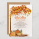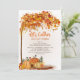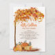 Thanksgiving dinner invitation with orange pumpkins and colorful fall leaves. Text is customizable, so write your own message.