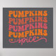 The "Pumpkins Spice" design is a fun and vibrant representation of the beloved fall flavor, pumpkin spice. The design prominently features the word "PUMPKINS" repeated five times in a bold, retro-style font with rounded edges, each instance stacked on top of the other. The repetition emphasizes the word and makes the design instantly recognizable as a celebration of all things pumpkin.