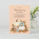 Gather family and friends in style with this elegant Thanksgiving Dinner invitation. The design features a charming arrangement of soft white, cream, and muted teal pumpkins accented with autumn leaves, golden sunflowers, and rustic wooden details. Set against a warm peach background, the artwork creates a cozy seasonal feel while keeping the focus on your personalized event details. Perfect for Thanksgiving gatherings, Friendsgiving celebrations, or fall harvest dinners, this invitation blends modern farmhouse style with timeless autumn charm. Customize with your dinner date, time, location, and RSVP information to make it uniquely yours. A beautiful way to invite loved ones to share a meal, gratitude, and cherished memories together this Thanksgiving season.
