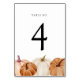 Table number card prints on front and back (double-sided). Design features watercolor pumpkins. Items are printed exactly as they appear on your screen when you add to cart, so personalize and add each table number that you need to your cart individually.