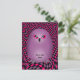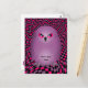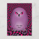Cute punk owl in purple on a swirly checkerboard background in purple, hot pink, and black on a cute post card.