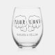 Add your names to create a personalized anniversary gift. This stemless wine glass features a simple graphic in black with two fists with "TRUE LOVE" spelled out in tattoo letters on the fingers with your names (or other text) below in typewriter style font. The modern gift for the third anniversary is glass, making this personalized wineglass a perfect choice for 3rd anniversaries.
