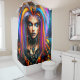 This shower curtain has a colorful punk rocker on it.
