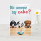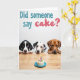 This greeting card shows three young dogs lined up side by side, their front paws resting on a warm, textured wooden table as they lean forward with eager, friendly expressions ❤️. One pup has dark-and-white fur, another is white with dark spots, and the third wears a rich reddish-brown coat, each with wide, shining eyes fixed on the same treat. Centered on the table sits a small white-frosted cake on a bright blue plate, drawing everyone’s attention like a shared secret. A light scatter of colorful sprinkles dots the frosting, and two thin candles stand upright on top. The dogs’ close grouping and intent gazes create a cozy sense of togetherness, like friends waiting to share the first bite 🌼. Above the scene, the phrase “Did someone say cake?” appears in teal and coral lettering, placed against a plain white background. Soft, even lighting brings out the fine fur texture and the visible grain lines in the wood beneath their paws. The final detail is the tiny cake centered on the vivid blue plate, with two slender candles rising above the sprinkled frosting.