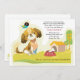 This cute invitation is perfect for a child's birthday celebration. It features a puppy, his doghouse, a bone in a dish and a chirping bird perched on the puppy's head. The card is easy to customize with your wording, font, font color and choice of six paper types.