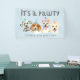 Cute party banner for your child's puppy theme birthday party. Illustration of 4 dogs (dalmatian, beagle, pit bull terrier) with party hats. The text above says "it's a pawty" and you can add your child's name under the illustration.
