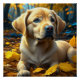 Cute puppy dog playing in yellow fall leaves poster.