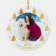 Personalize this Christmas ornament to celebrate your dog's first Christmas. The template is set up for you to add your favorite photo of your pet, a name and the year. Your photo is framed with gold Christmas trees and stars, on a snow white background. The back of the ornament has a similar Christmas tree pattern. Please browse our store for alternative styles and colors