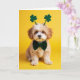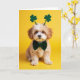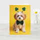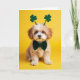 This card shows a small puppy centered on a smooth, sunny yellow background, looking straight out with big dark eyes that feel like they’re holding your gaze a second longer than expected. Its fluffy fur mixes creamy white with warm golden-brown patches, and the soft lighting makes the coat look extra plush. Perched on its head are green shamrock antennae that tilt slightly, adding a light St. Patrick’s Day touch ☘️. A deep green bow tie sits neatly at the neck, giving the pup a dressed-up look that pairs sweetly with its gentle expression 💚. The main greeting text is placed near the top in green lettering that stands out clearly against the yellow, with a smaller line of text set beneath it in a matching green tone. The layout stays simple and centered so your eyes move from the greeting down to the pup’s face and bow tie. Tiny paw tips show a soft pink tint near the bottom edge of the image.