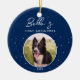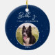 Puppy First Christmas Border Collie Dog Photo Ceramic Ornament. Trendy white script on a dark blue background. Custom photo in a round frame. Add your dog photo, name and year.