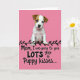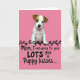 This Mother's Day card features a vertical layout with a small, sweet puppy centered against a bubblegum-pink background, looking outward with big dark eyes that feel like a tender, trusting glance ❤️. The pup’s fur is mostly white, with warm caramel-brown patches on the ears and around the eyes, and the lighting makes the coat look soft and touchable. The simple backdrop keeps the focus on that affectionate expression, like the puppy is quietly offering comfort and closeness. Beneath the puppy, a dark leafy vine stretches across as a decorative divider, adding a gentle, garden-like touch 🌼. Below that, the message is placed near the bottom in dark lettering and reads, “Mom, I was going to give LOTS you of Puppy kisses...”. The word “LOTS” stands out in all caps, giving the line a teasing, friendly emphasis that pairs with the pup’s earnest face. Everything sits on a bright pink field, with the puppy centered above the vine and the text stacked neatly underneath.