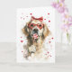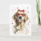 A charming golden retriever adorned with heart-shaped glasses and a vibrant red bow, holding a candy cane lollipop, surrounded by scattered red hearts. Perfect for sending warm and playful Valentine's Day wishes.