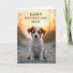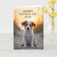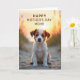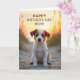 Designed with a sweet coastal scene, the card features a small puppy with white and reddish-brown fur sitting on softly rippled sand, looking forward with a trusting, tender gaze that feels like a quiet bond ❤️. Warm golden light from dawn or dusk wraps around the pup, creating a gentle halo along its head and ears and catching the fine hairs like a soft outline. The background fades into a blurred mix of amber and muted green, suggesting distant dunes or seaside plants and keeping the focus on the puppy. Across the top, the message “HAPPY MOTHER’S DAY MOM!” is placed prominently in deep reddish-brown lettering that echoes the pup’s markings. The overall color palette stays warm and calm, with sunlit golds and earthy tones that read like an affectionate moment held still. The puppy’s relaxed posture and steady eye contact add a friendly, caring mood without needing anything else 🌼. The sand beneath is lightly textured, with small ridges and shadows leading toward the softly glowing horizon.