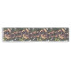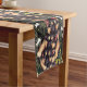 A close-up of a wooden table with a table runner featuring a playful design of German Shepherd puppies peeking out from tall grass and daisies.